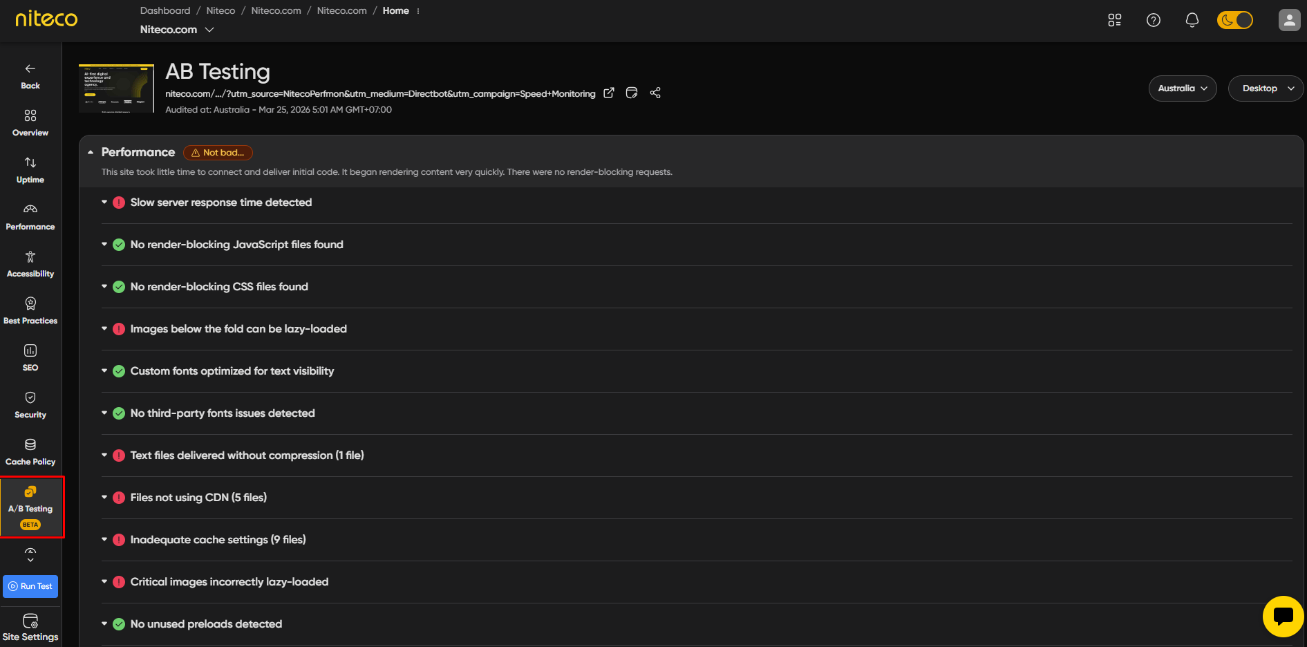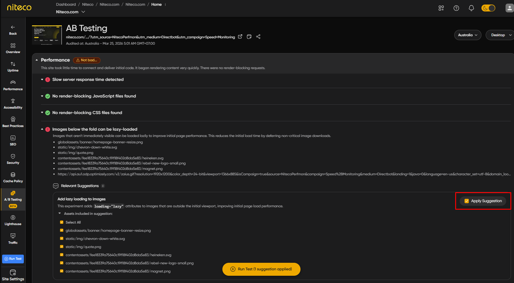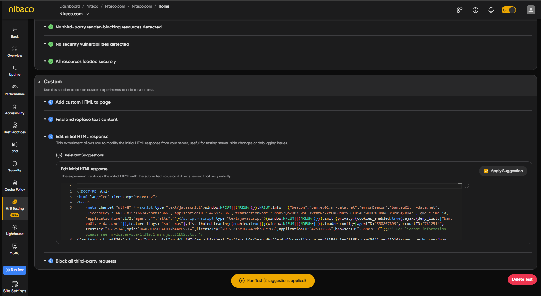 We are excited to announce the launch of a new beta feature called A/B Testing in the Performance Insights tool, a new way to experiment with optimizations on any page before modifying your codebase. A/B Testing lets you select suggested optimizations from four categories — Performance, Accessibility, Best Practices, and Custom — and run them as an experiment against your original test.