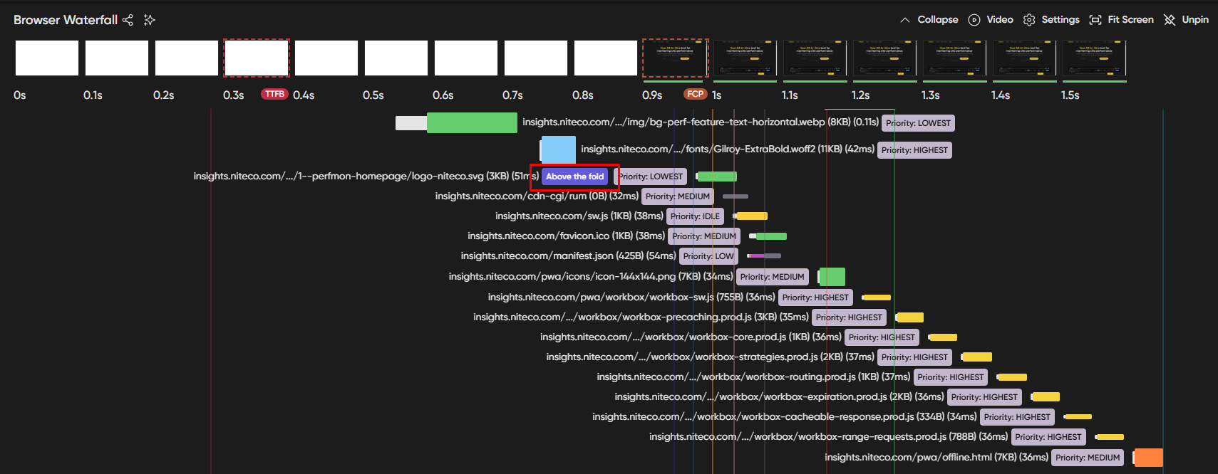 Resources that load above the fold are now automatically tagged in the Browser Waterfall view. This helps you easily identify critical assets that affect the first visible part of the page, so you can optimize them to improve the user’s initial loading experience.