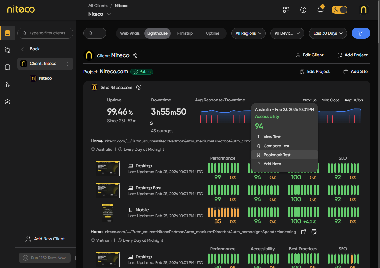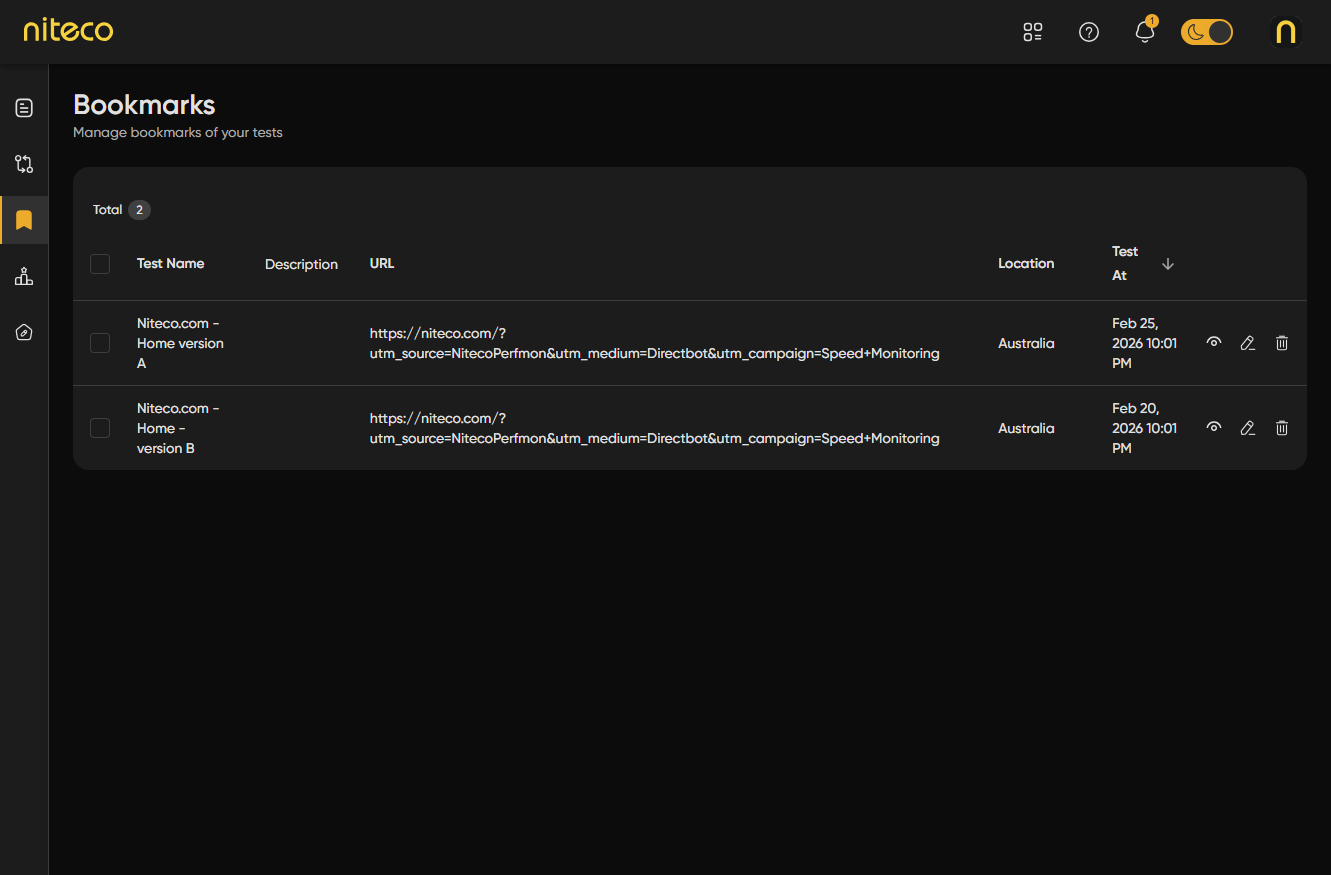 Bookmarks let you save specific test results for future reference. When you bookmark a test, it appears in your Bookmarks page, where you can view, organize, and revisit your saved tests at any time. You can also use bookmarks to build compare sessions—see Compare Tests for that workflow.