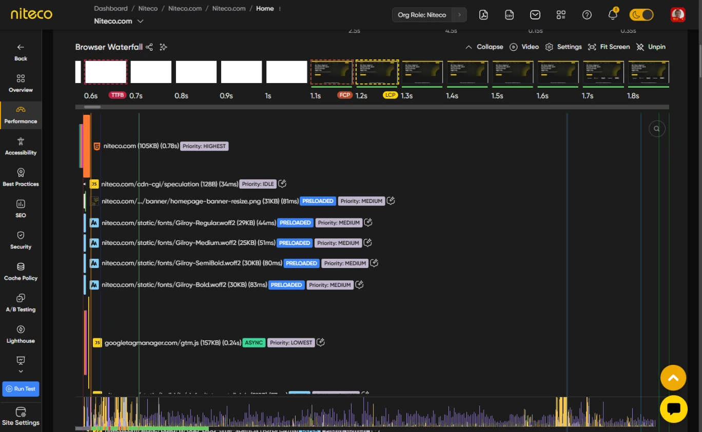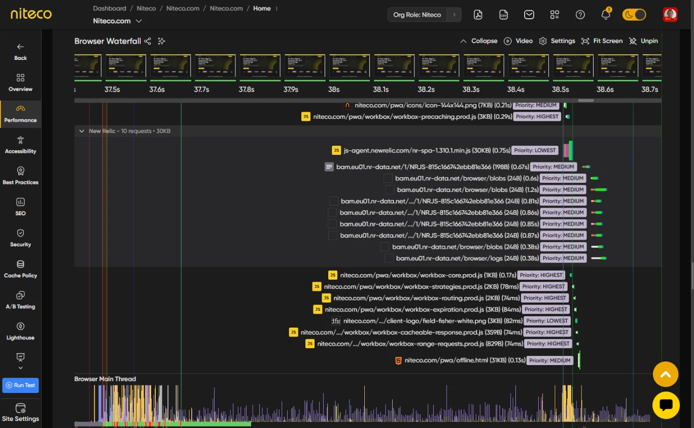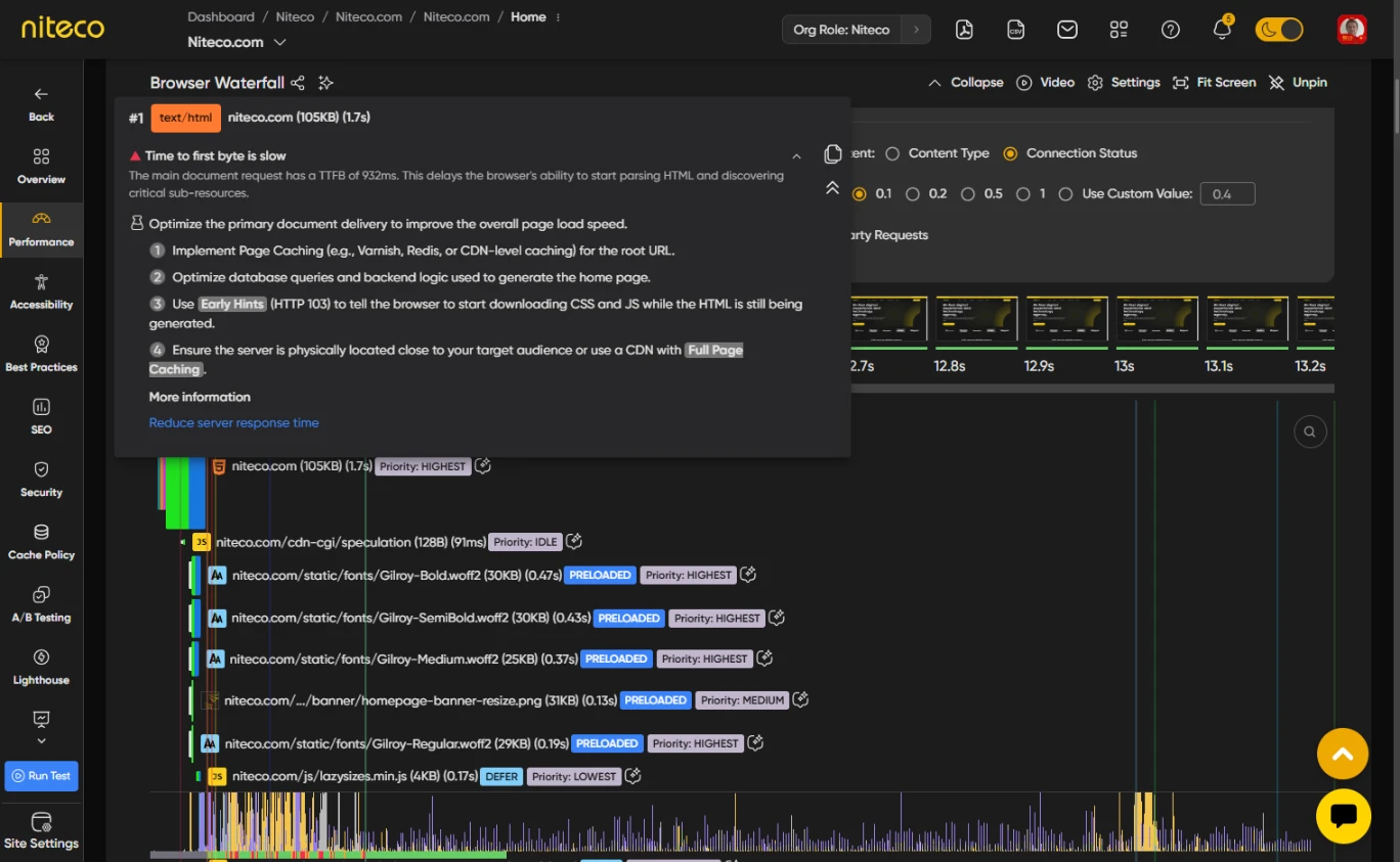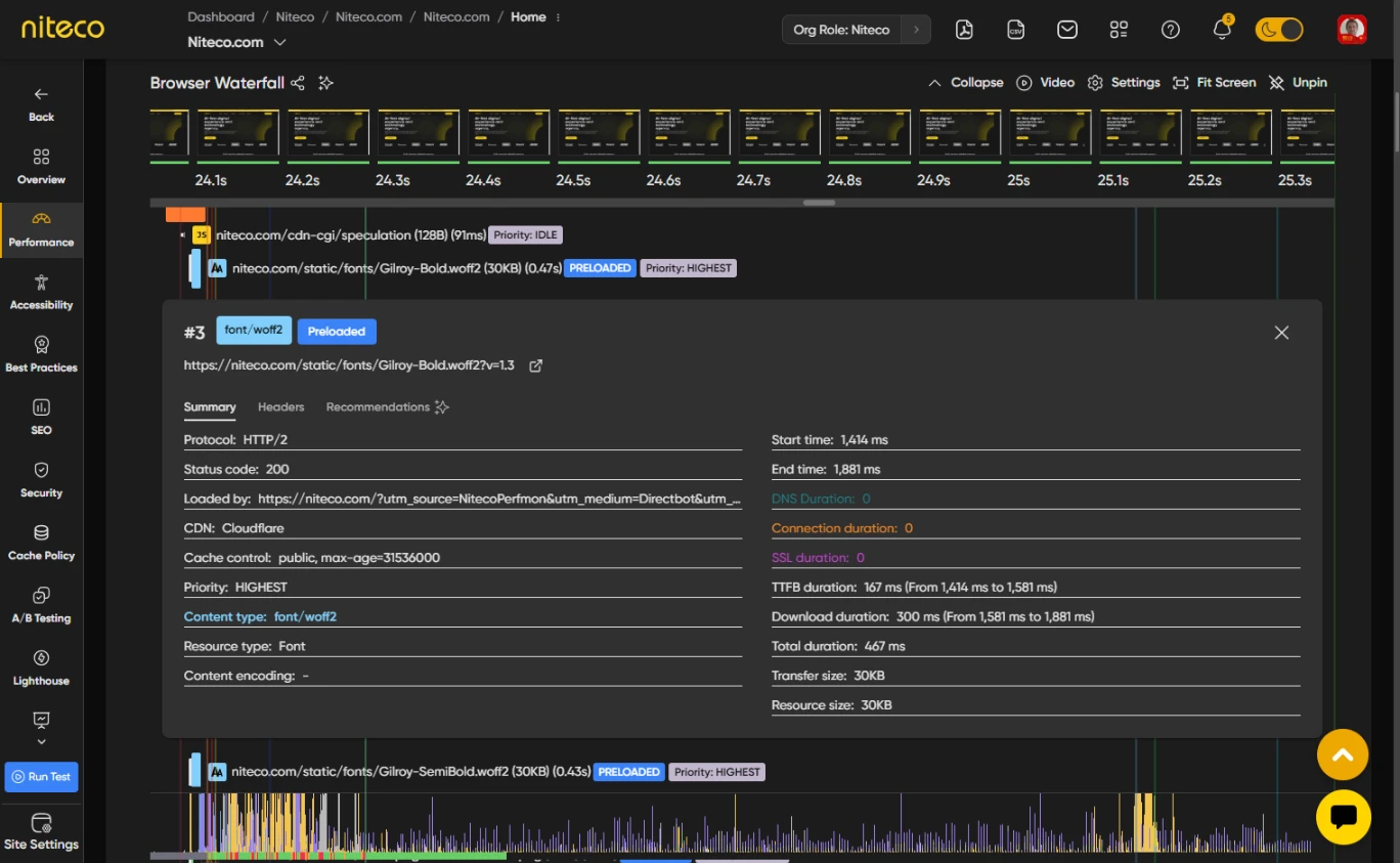 The HAR view (browser waterfall) in a performance report shows every request the page makes: URLs, timing, size, and type. You can adjust how the waterfall is shown, inspect individual requests in the request detail panel (Summary, Headers, Certificate, HTML Source), and run an AI analysis to get fix suggestions for slow or problematic resources. This is extremely useful for tracking down what is slowing the page, which requests block rendering, and how to optimize images, scripts, or third-party calls.