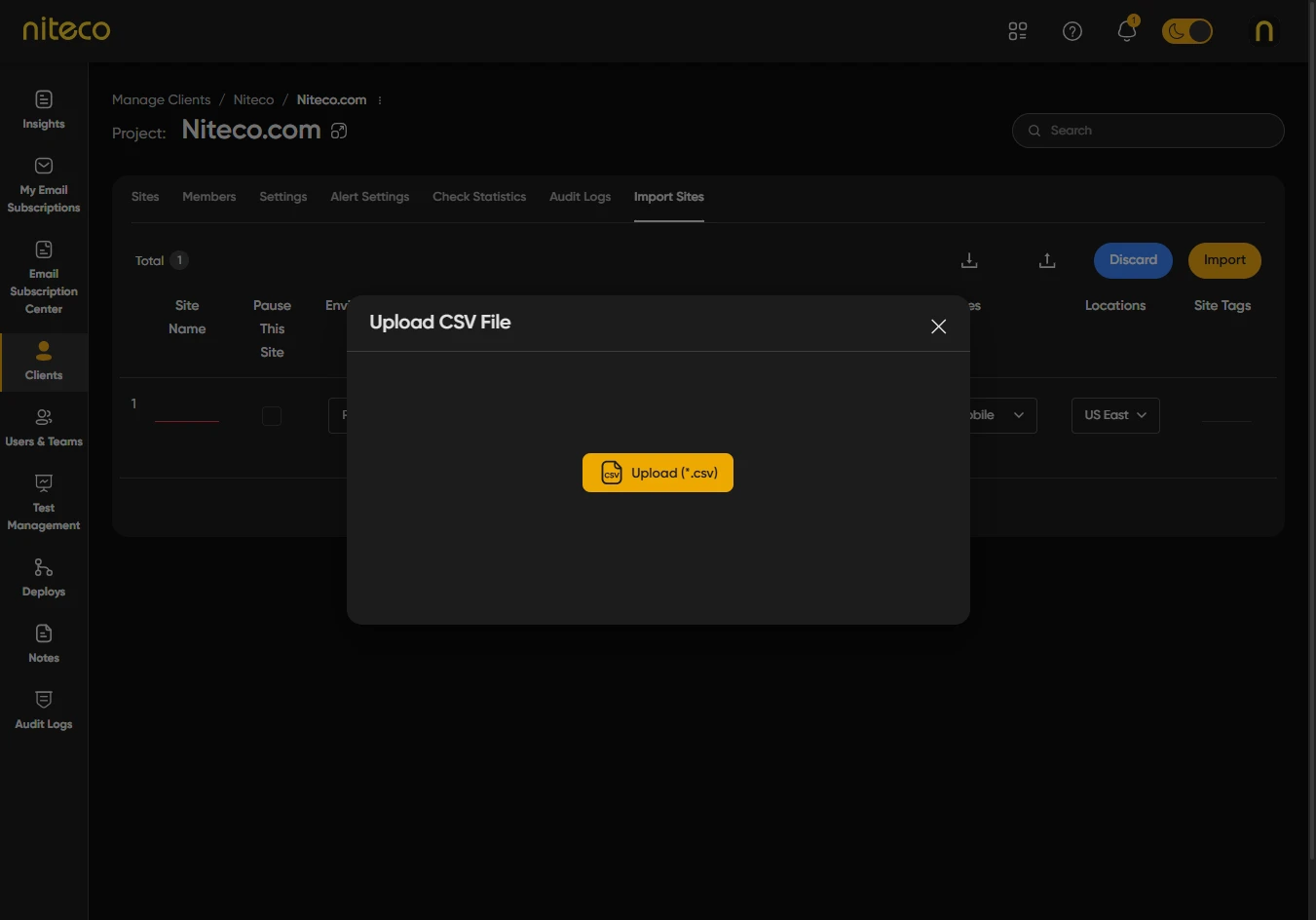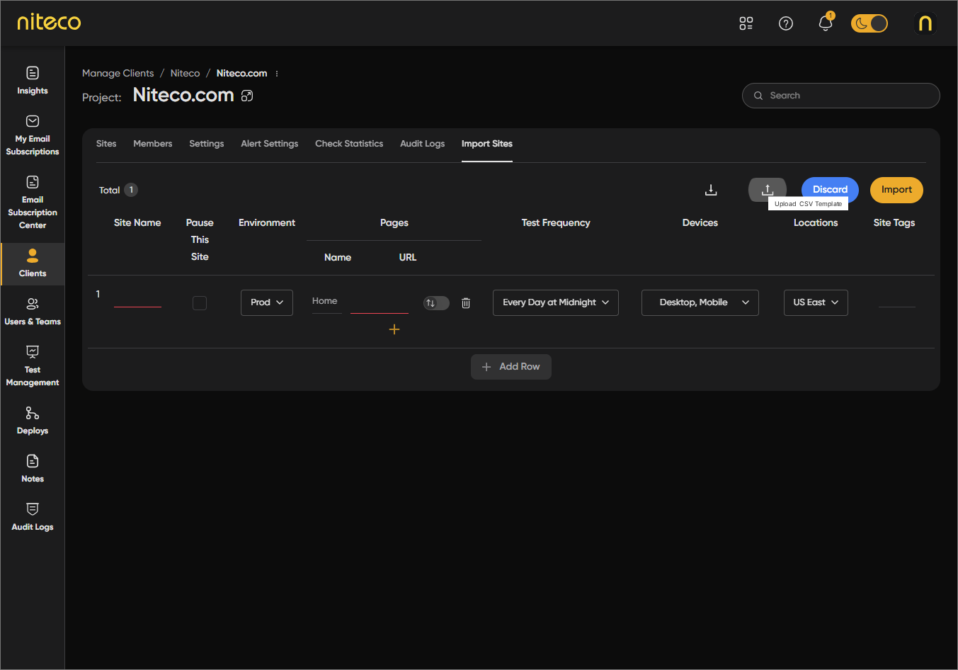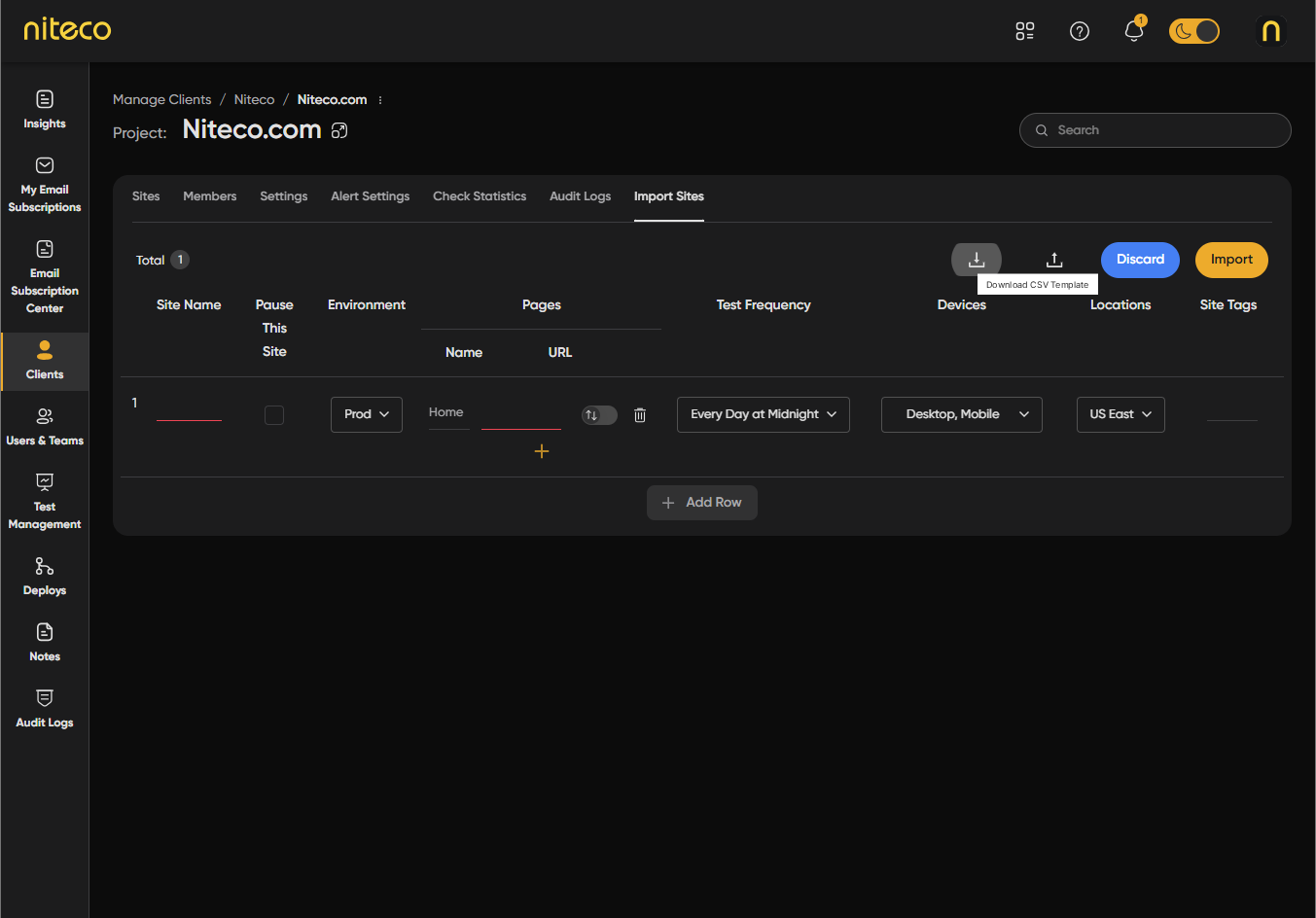 Import Sites lets you add many sites and pages to a project at once by uploading a CSV file. You can download a template, fill in site names, page URLs, and optional tags, then upload the file and apply default settings (locations, devices, test frequency, and so on) to all imported sites. After reviewing or editing the list, you run the import. This is useful when you have a large number of sites to add or when your site list is already in a spreadsheet.