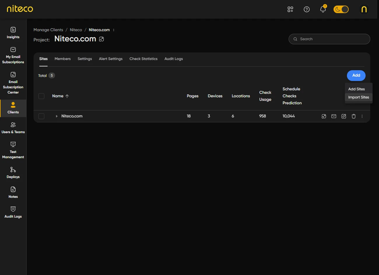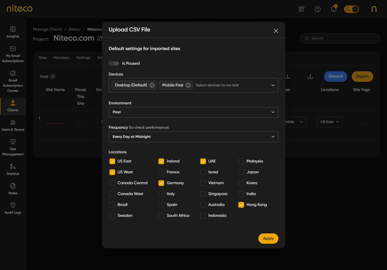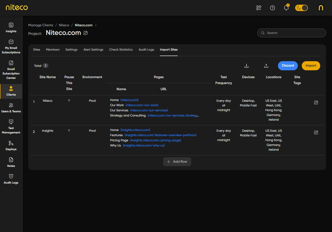 Import Sites lets you add many sites and pages to a project at once by uploading a CSV file. You can download a template, fill in site names, page URLs, and optional tags, then upload the file and apply default settings (locations, devices, test frequency, and so on) to all imported sites. After reviewing or editing the list, you run the import. This is useful when you have a large number of sites to add or when your site list is already in a spreadsheet.