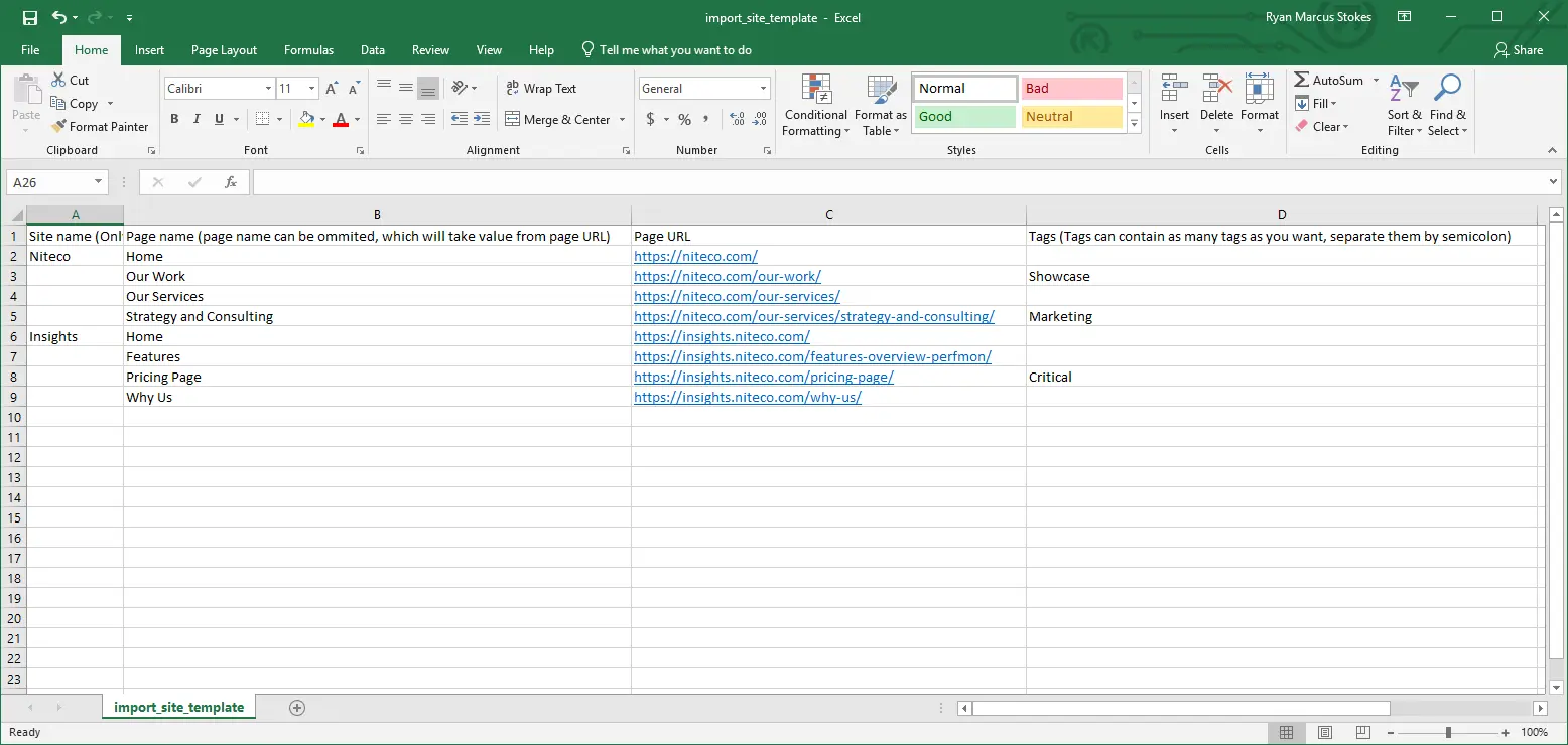 - Another page for the same site – Leave Site name blank. Fill in Page name, Page URL, and Tags as needed. That row is added as an extra page to the site in the row above.