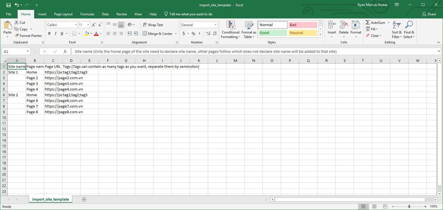 Page URL is required and must be a valid URL. Site name is required for the first row of each site; for following rows that belong to the same site, leave Site name empty.